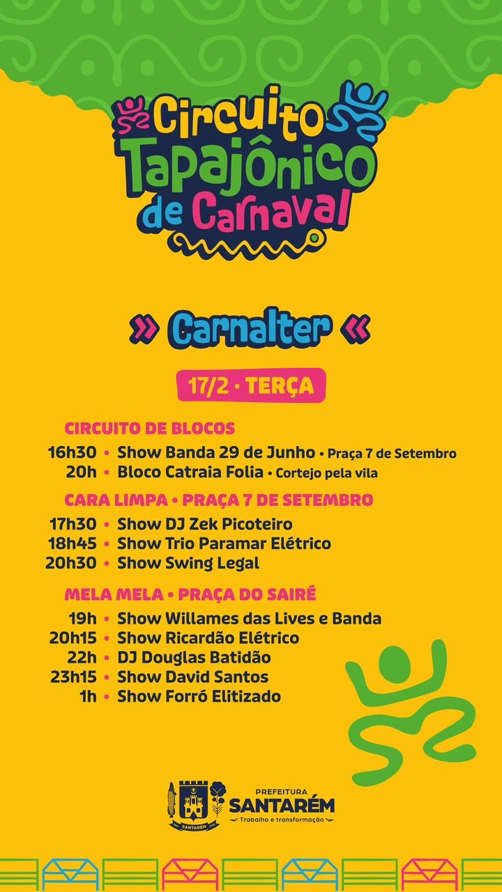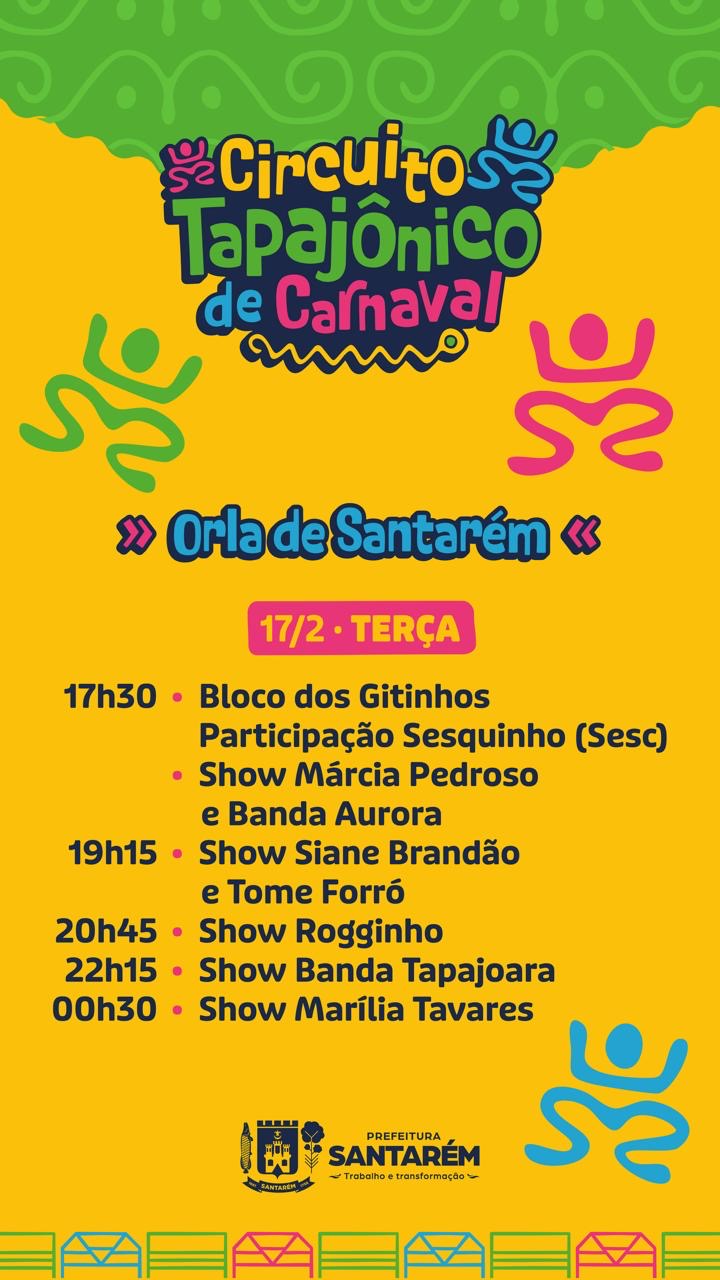A programação do Circuito Tapajônico de Carnaval desta semana passou por ajustes após o cancelamento das atividades previstas para a segunda-feira, dia 16. A decisão foi tomada em razão das fortes chuvas que atingiram Santarém e Alter do Chão, inviabilizando a realização segura dos eventos ao ar livre. Com isso, a Secretaria Municipal de Cultura reorganizou a agenda para garantir que as atrações fossem mantidas dentro do restante do circuito.