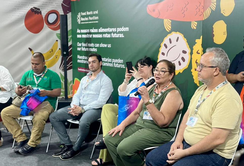 “Nossa maior dificuldade hoje é garantir as quantidades necessárias para abastecer a rede, a maior rede de alimentação escolar do Estado, que depende totalmente do que a natureza dá. Considerando que, se chover demais, a produção se perde, e se não chover também prejudica a produção; então nós, enquanto Semed, precisamos adaptar os cardápios de acordo com essa oferta. O convite veio como uma oportunidade de compartilhar as nossas vivências e conhecer mais sobre a diversidade que temos aqui e como se trabalha a mobilização como ação transformativa sobre os alimentos, o clima e a natureza; o que nós temos feito enquanto Secretaria de Educação para alavancar os sistemas de alimentação saudável e eficiente, em especial, já que no município trabalhamos diretamente com as produções de povos e comunidades tradicionais, sempre pensando na implementação e no aprimoramento das políticas públicas de segurança alimentar e nutricional, considerando as condições climáticas de uma cidade localizada no interior da Amazônia”, contou Vanda.