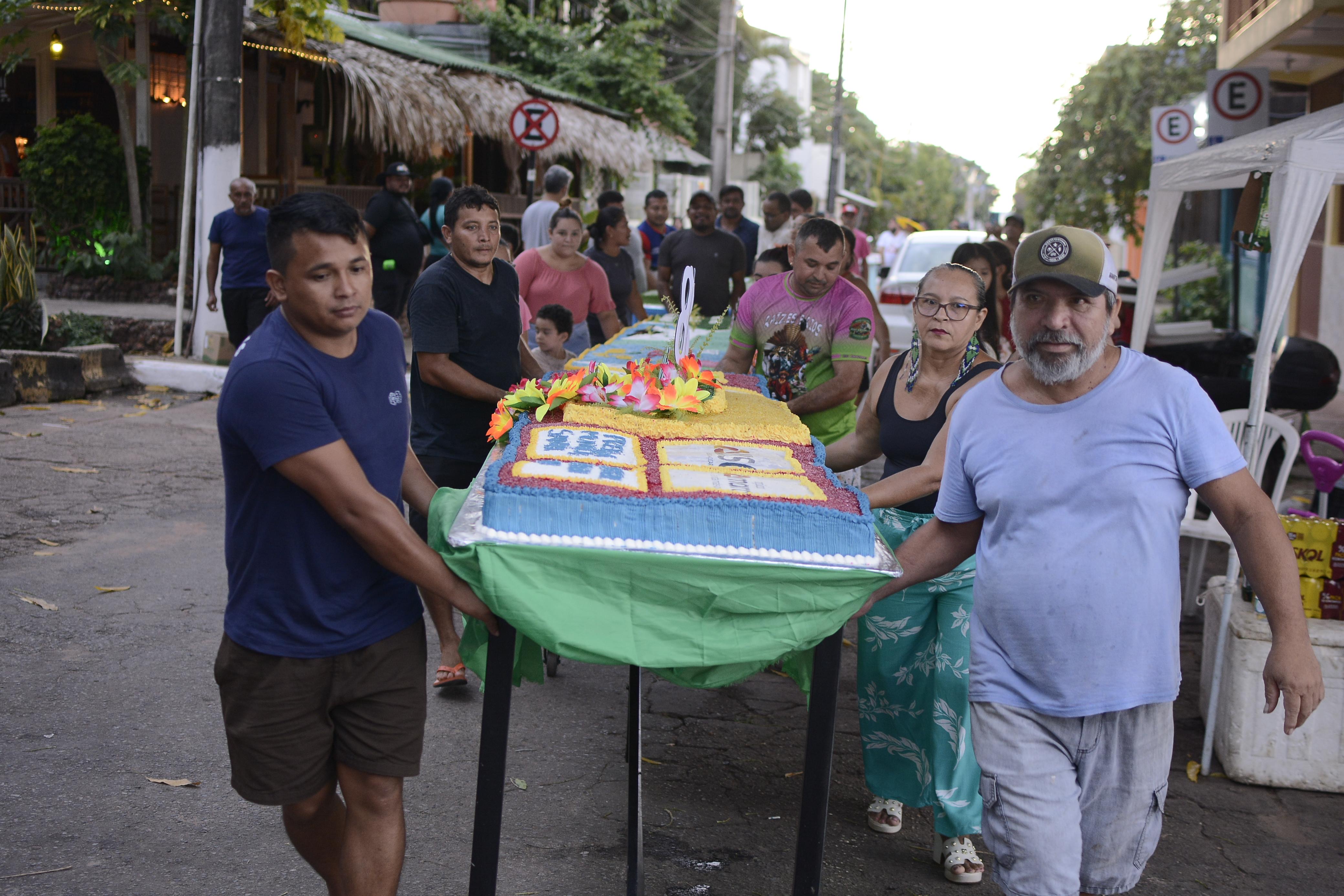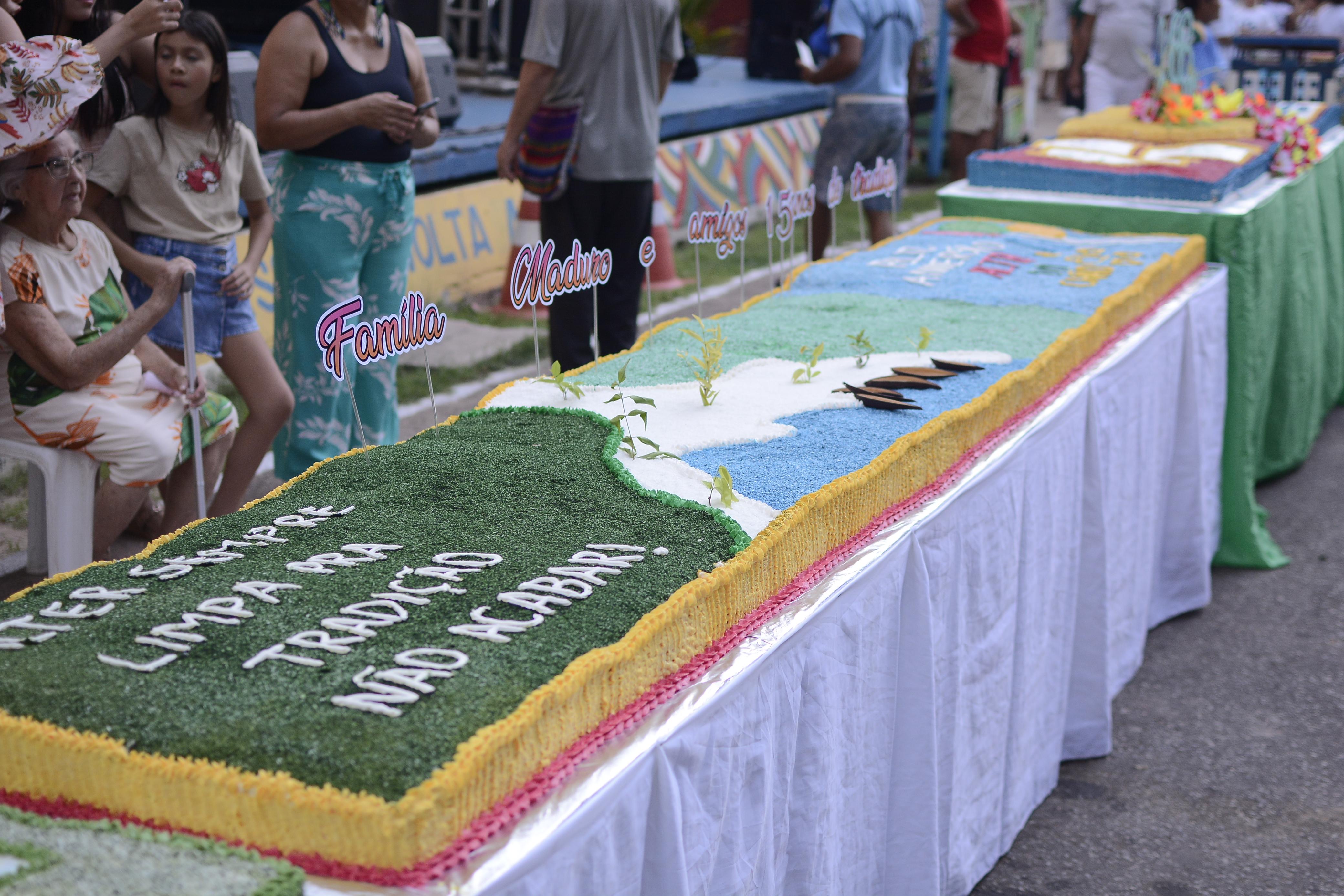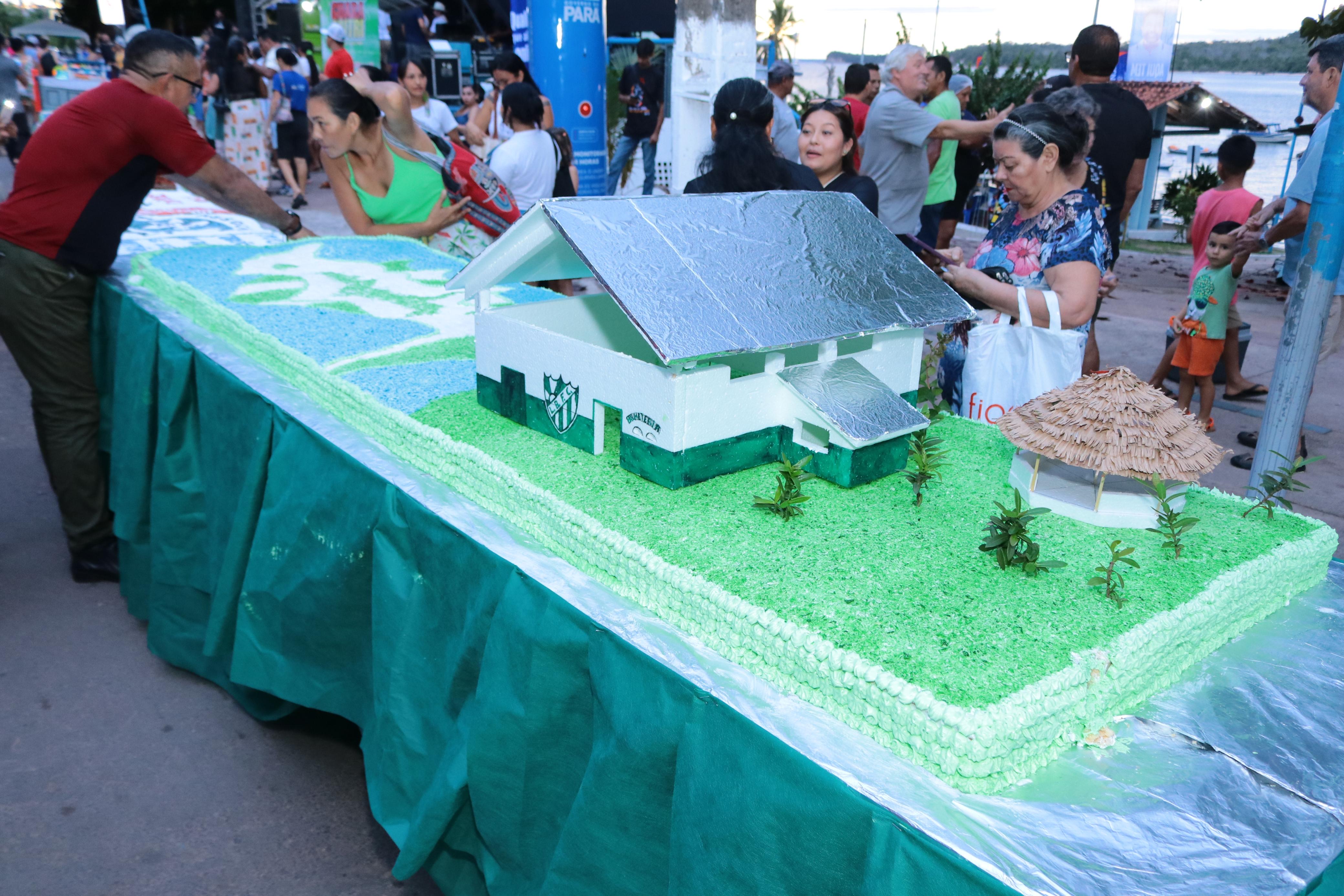 O grande destaque da noite foi o bolo coletivo. Instituições, grupos comunitários e moradores da vila levaram suas contribuições, organizadas lado a lado até formar o grande corredor doce. As decorações foram um espetáculo à parte e refletiram a identidade de Alter do Chão, com paisagens da vila, mensagens de conscientização ambiental, manifestações sociais e divulgações comerciais, formando um verdadeiro mosaico de expressões.