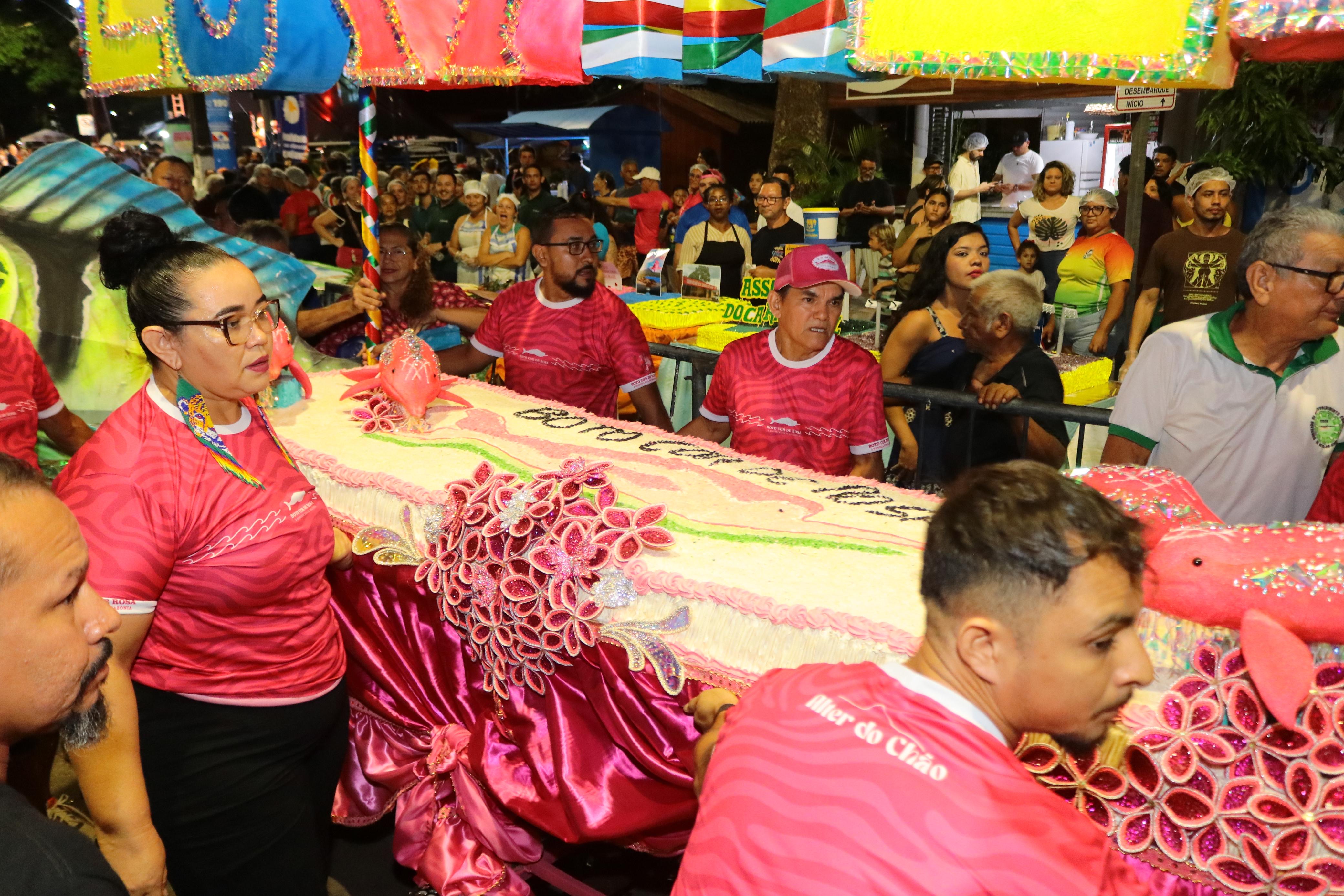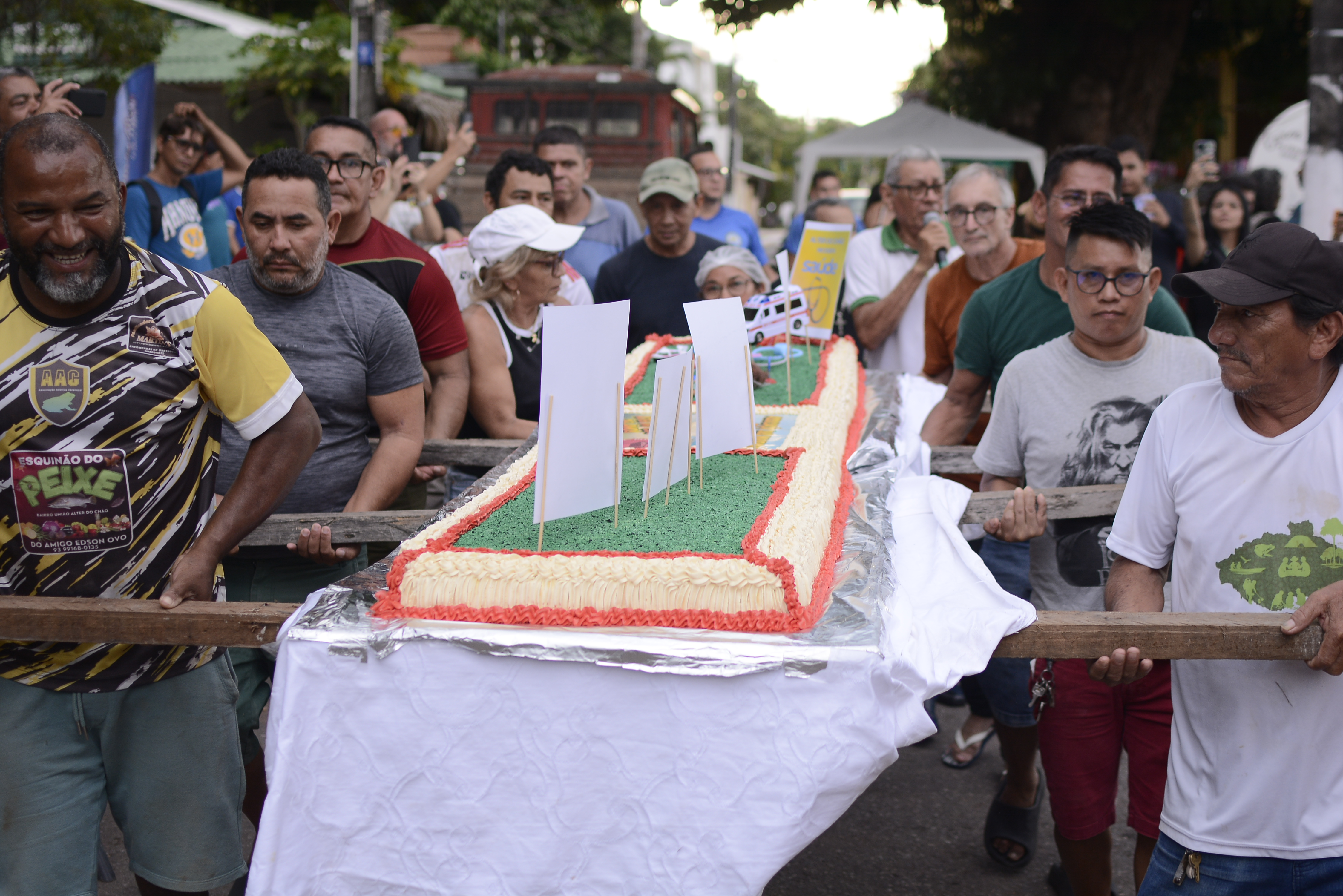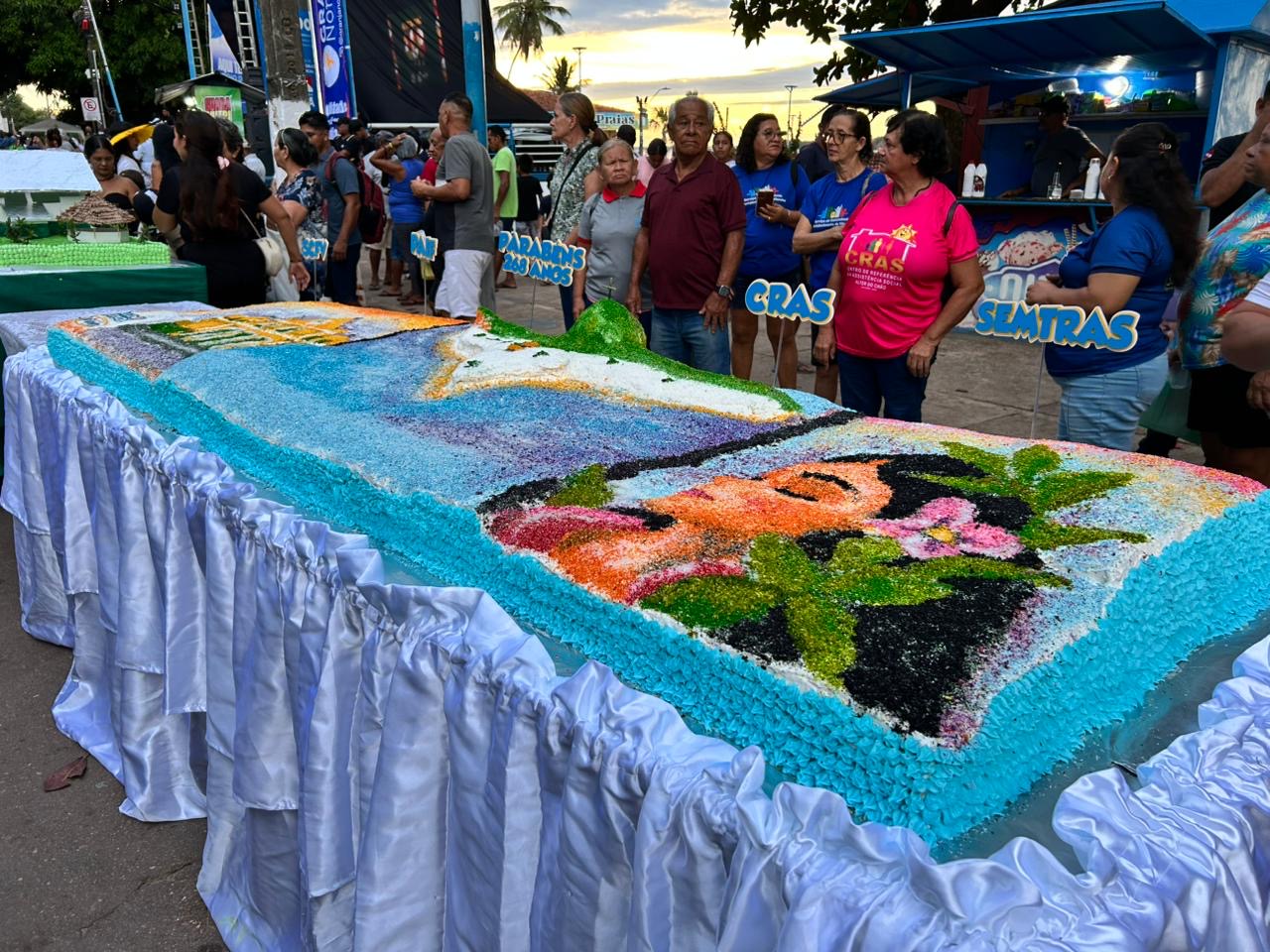 O grande destaque da noite foi o bolo coletivo. Instituições, grupos comunitários e moradores da vila levaram suas contribuições, organizadas lado a lado até formar o grande corredor doce. As decorações foram um espetáculo à parte e refletiram a identidade de Alter do Chão, com paisagens da vila, mensagens de conscientização ambiental, manifestações sociais e divulgações comerciais, formando um verdadeiro mosaico de expressões.