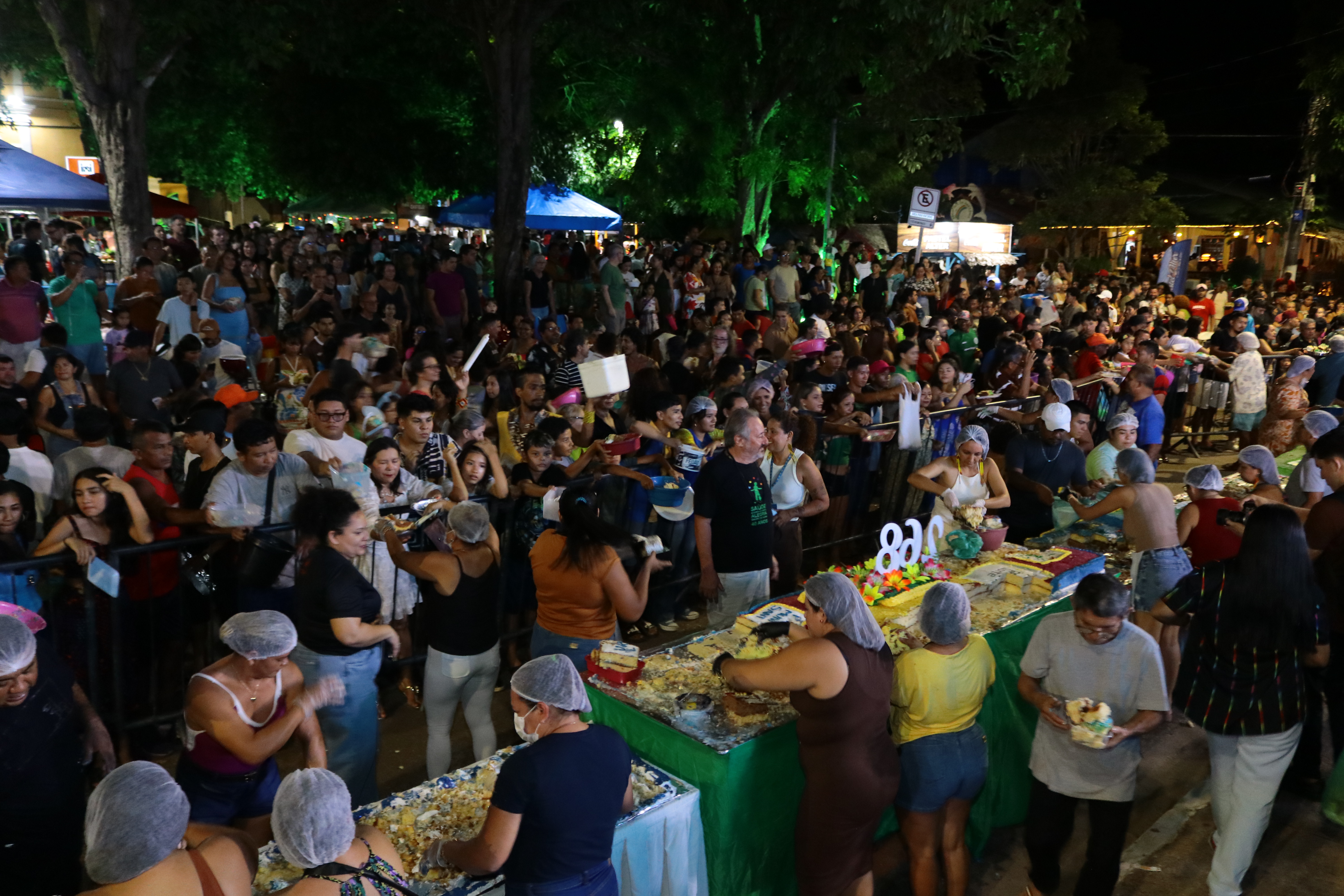Um corredor doce de 82 metros, formado pela união de dezenas de bolos preparados por cerca de 36 entidades, o banho de cheiro no coreto e uma programação musical com grandes atrações marcaram a noite de sexta-feira (6), na Praça 7 de Setembro, durante as comemorações pelos 268 anos do distrito de Alter do Chão. A iniciativa foi coordenada pelo Conselho Comunitário de Alter do Chão, com apoio da Prefeitura de Santarém, por meio da Secretaria Municipal de Cultura (Semc). A festa reuniu moradores e turistas em um momento de partilha, tradição e valorização da cultura local.