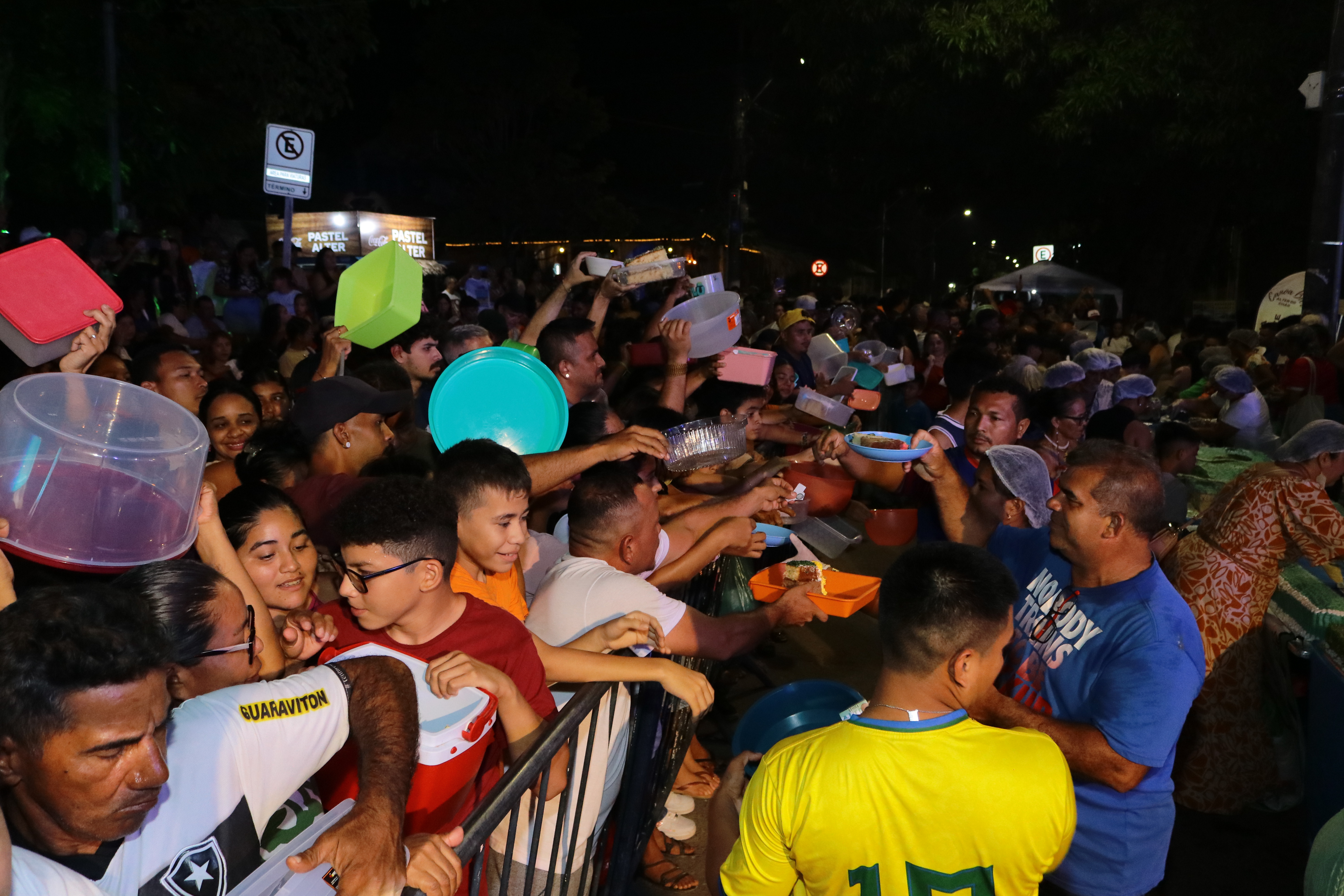 Após o corte, iniciou-se a distribuição dos bolos ao público. Moradores e visitantes levaram recipientes para garantir um pedaço da celebração. Neste ano, a organização adotou um sistema de fichas e proteção nas mesas, garantindo uma entrega mais organizada e segura para todos.