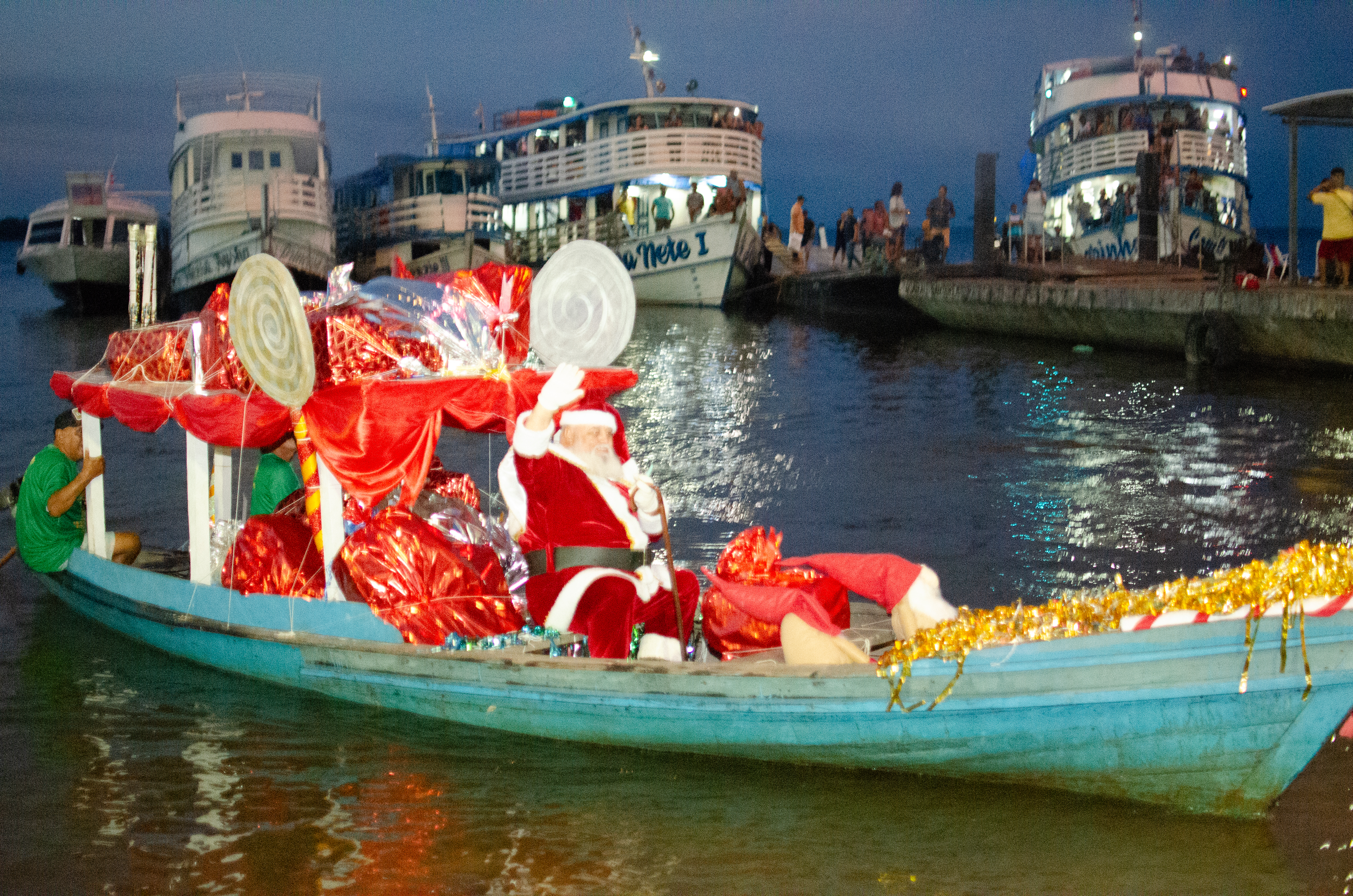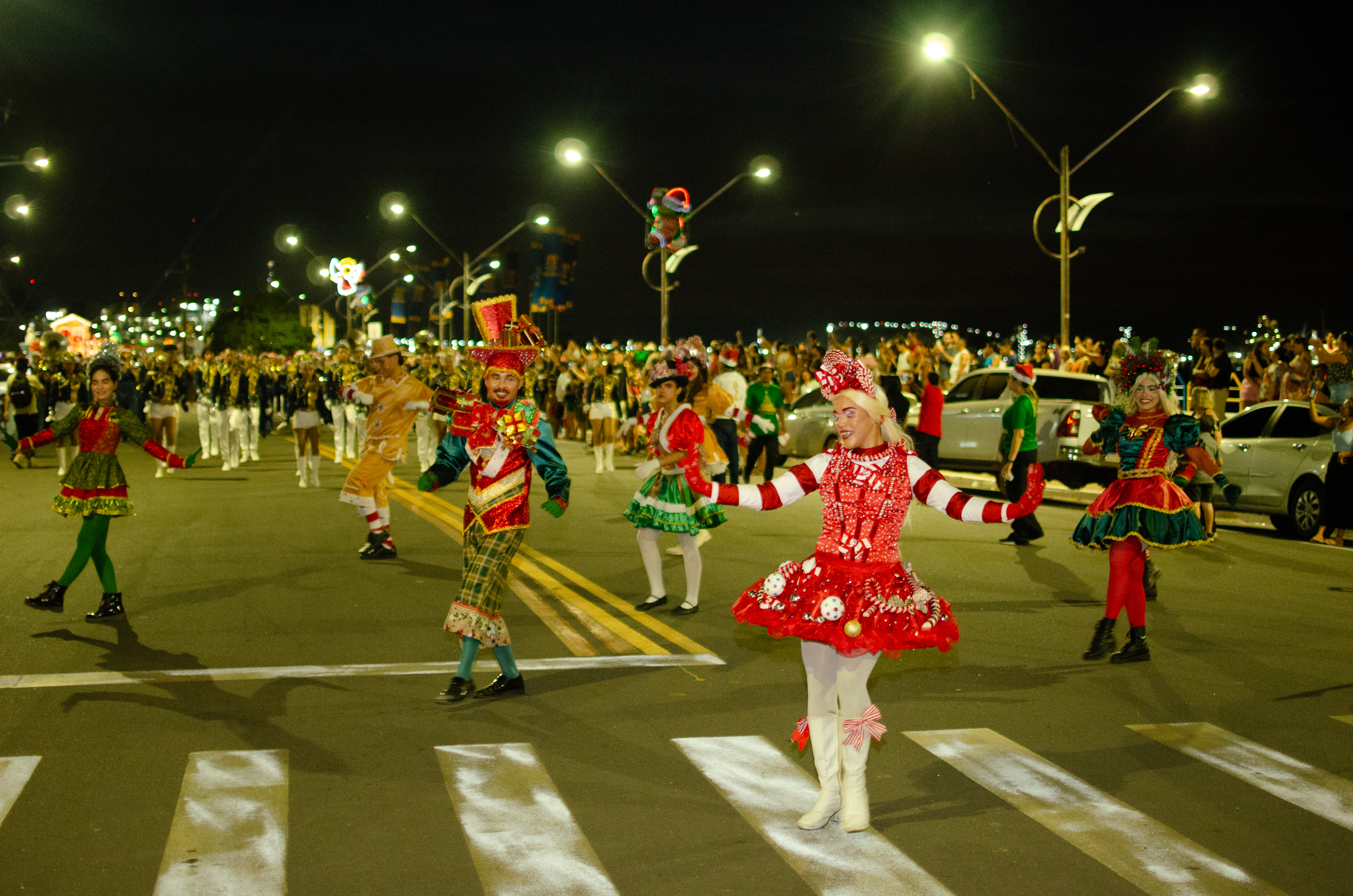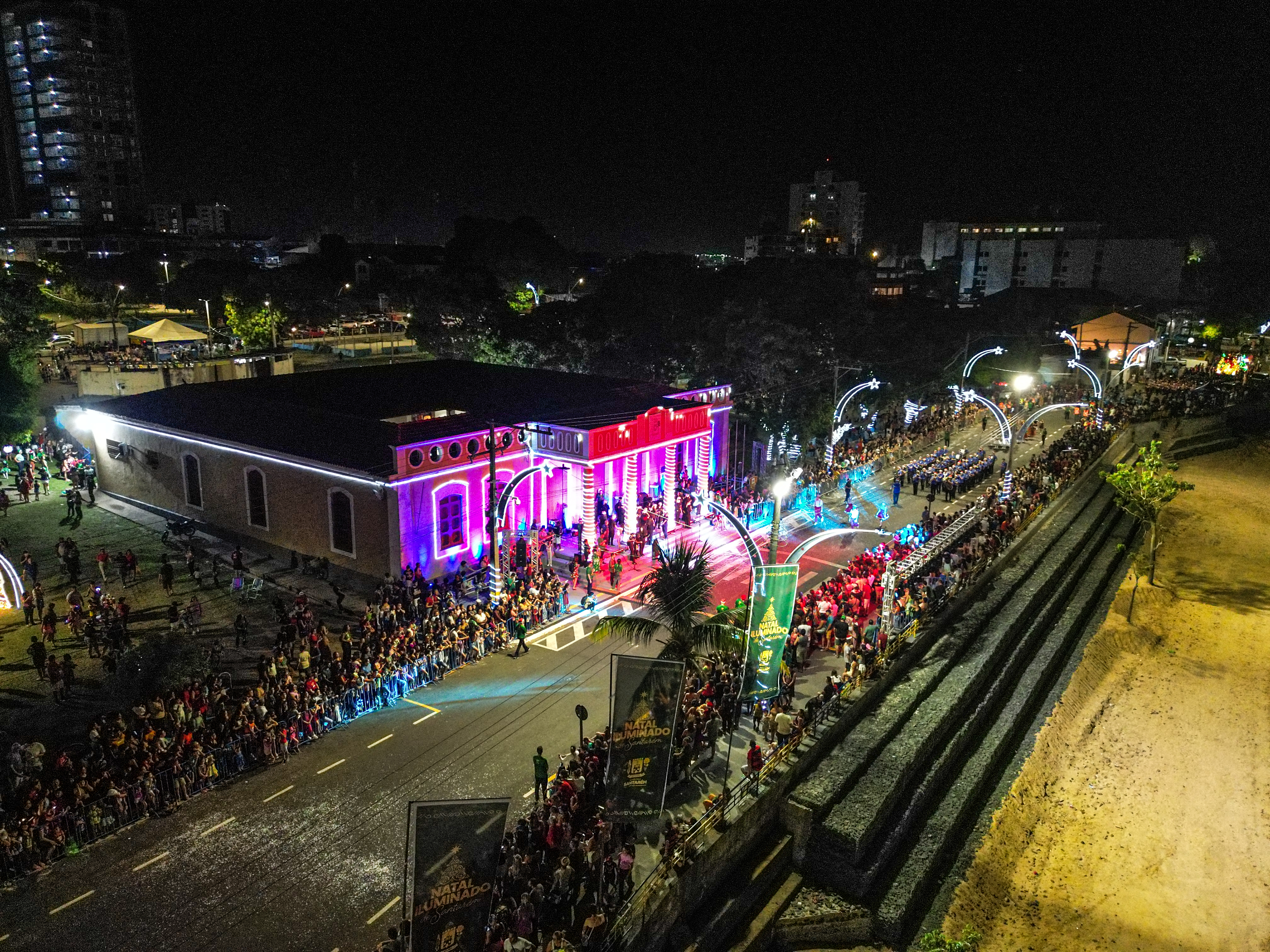Após a chegada pelo rio, o cortejo seguiu pela Avenida Tapajós, composto por alegorias, alas temáticas e performances artísticas que celebraram o espírito natalino, com apresentações de corpo de dança, artistas sobre patins e coreografias.