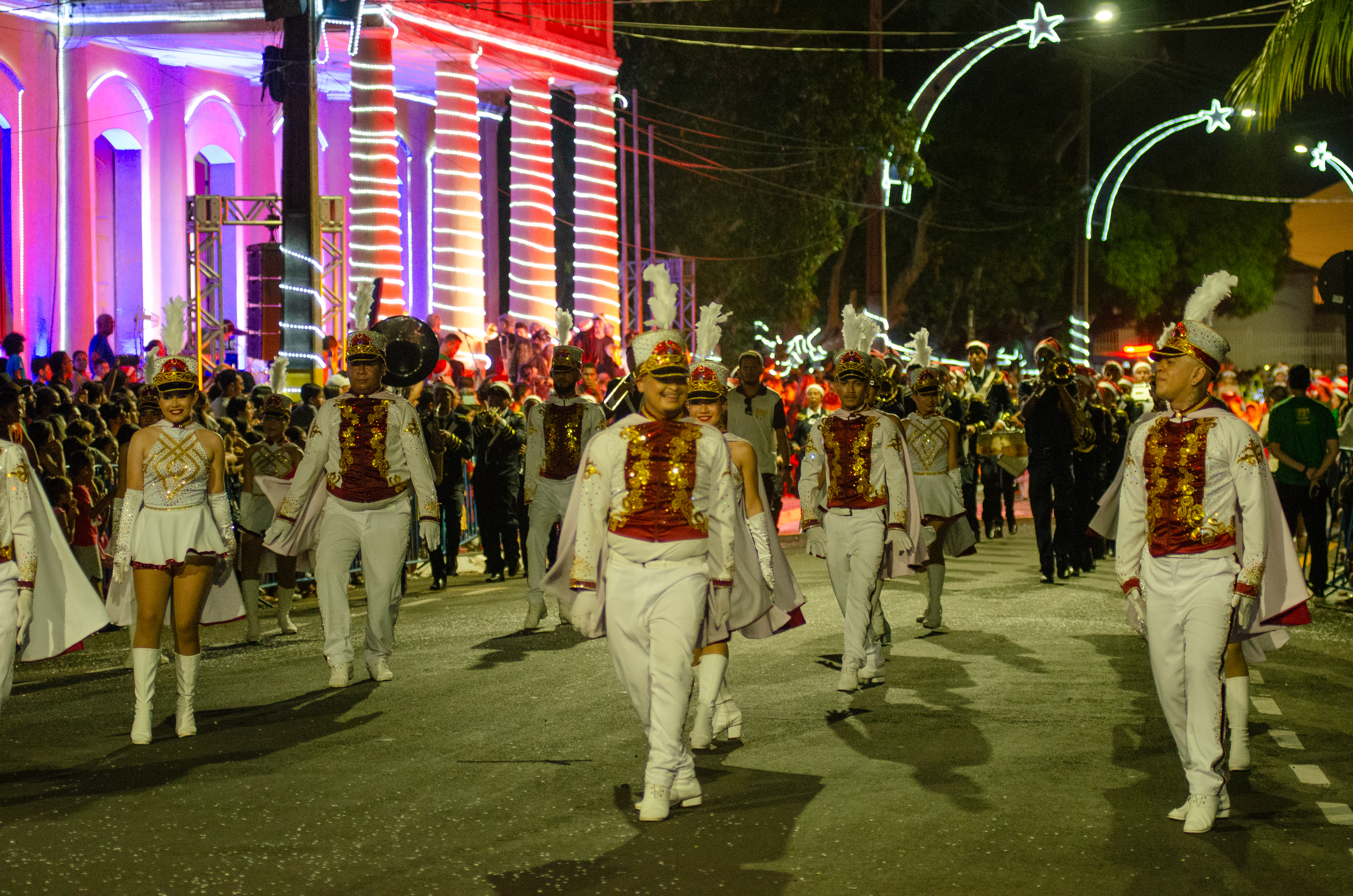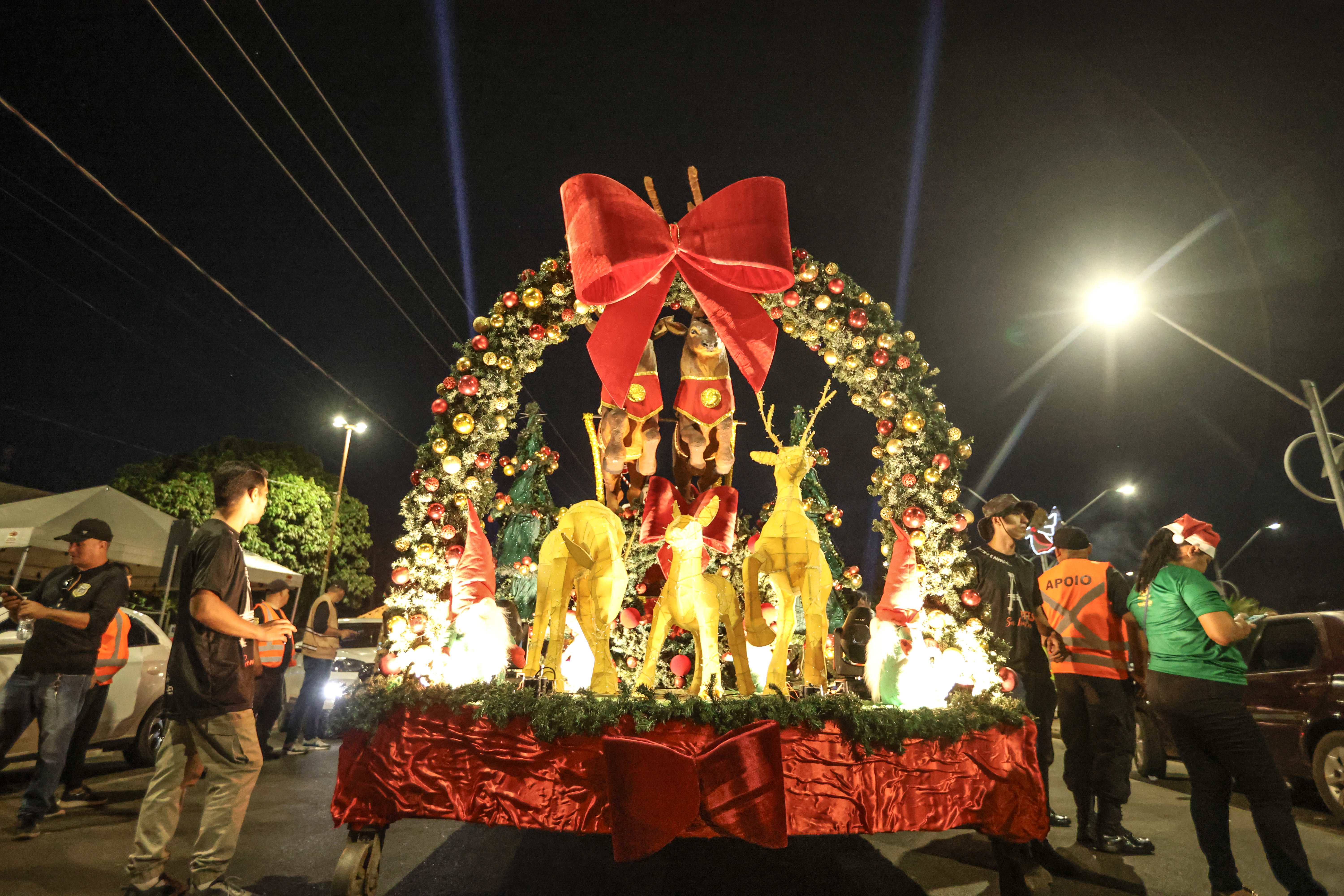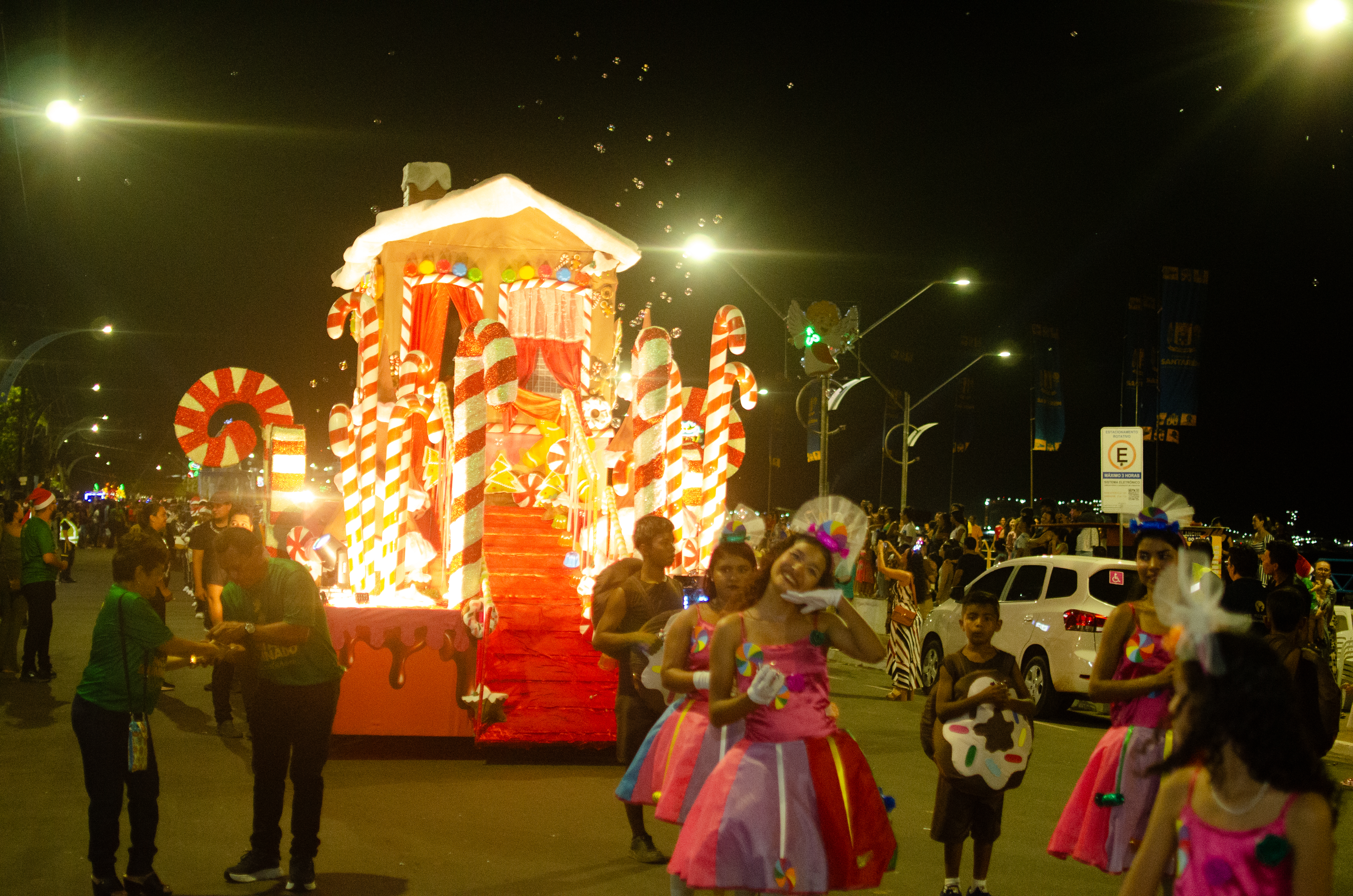 Após a chegada pelo rio, o cortejo seguiu pela Avenida Tapajós, composto por alegorias, alas temáticas e performances artísticas que celebraram o espírito natalino, com apresentações de corpo de dança, artistas sobre patins e coreografias.