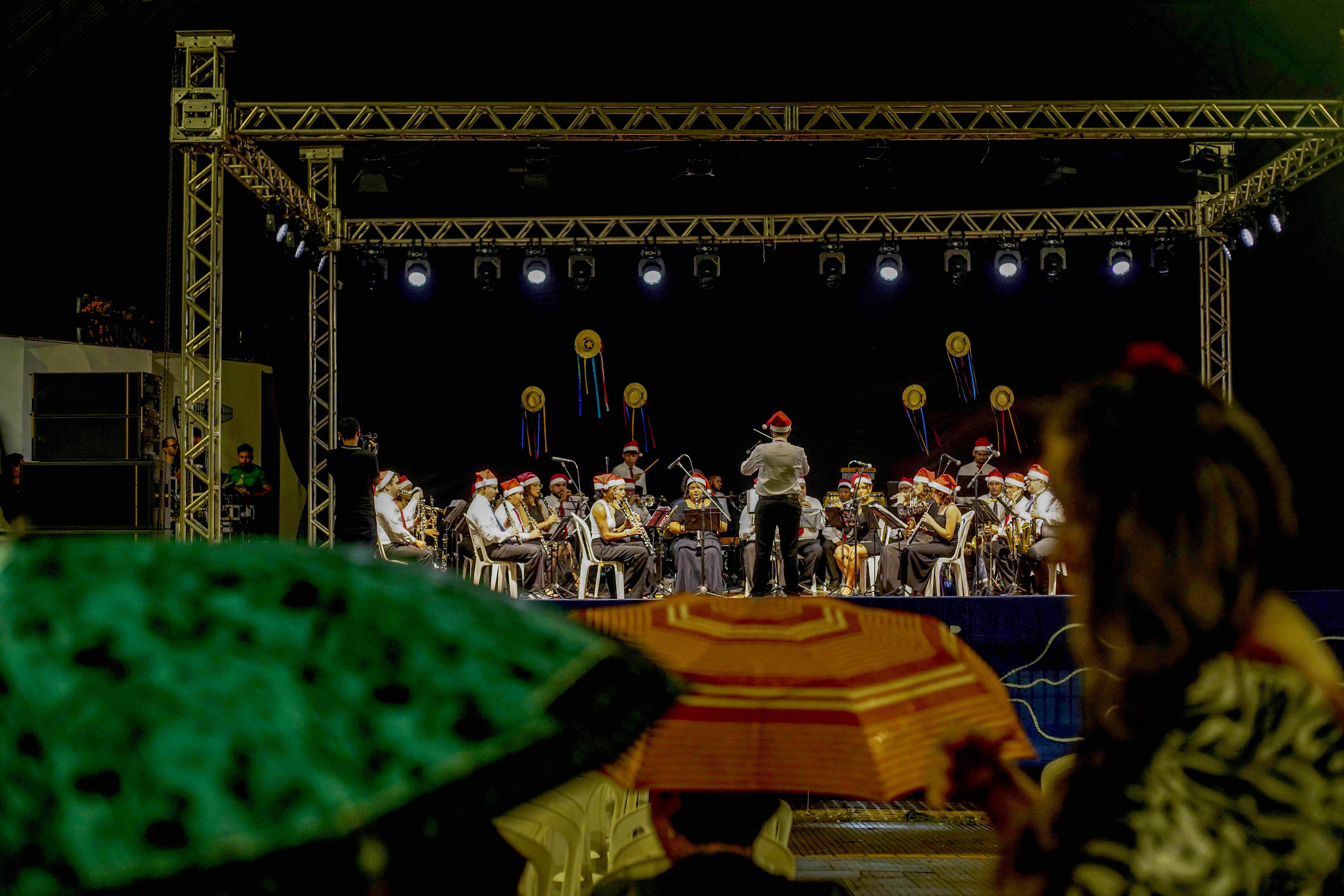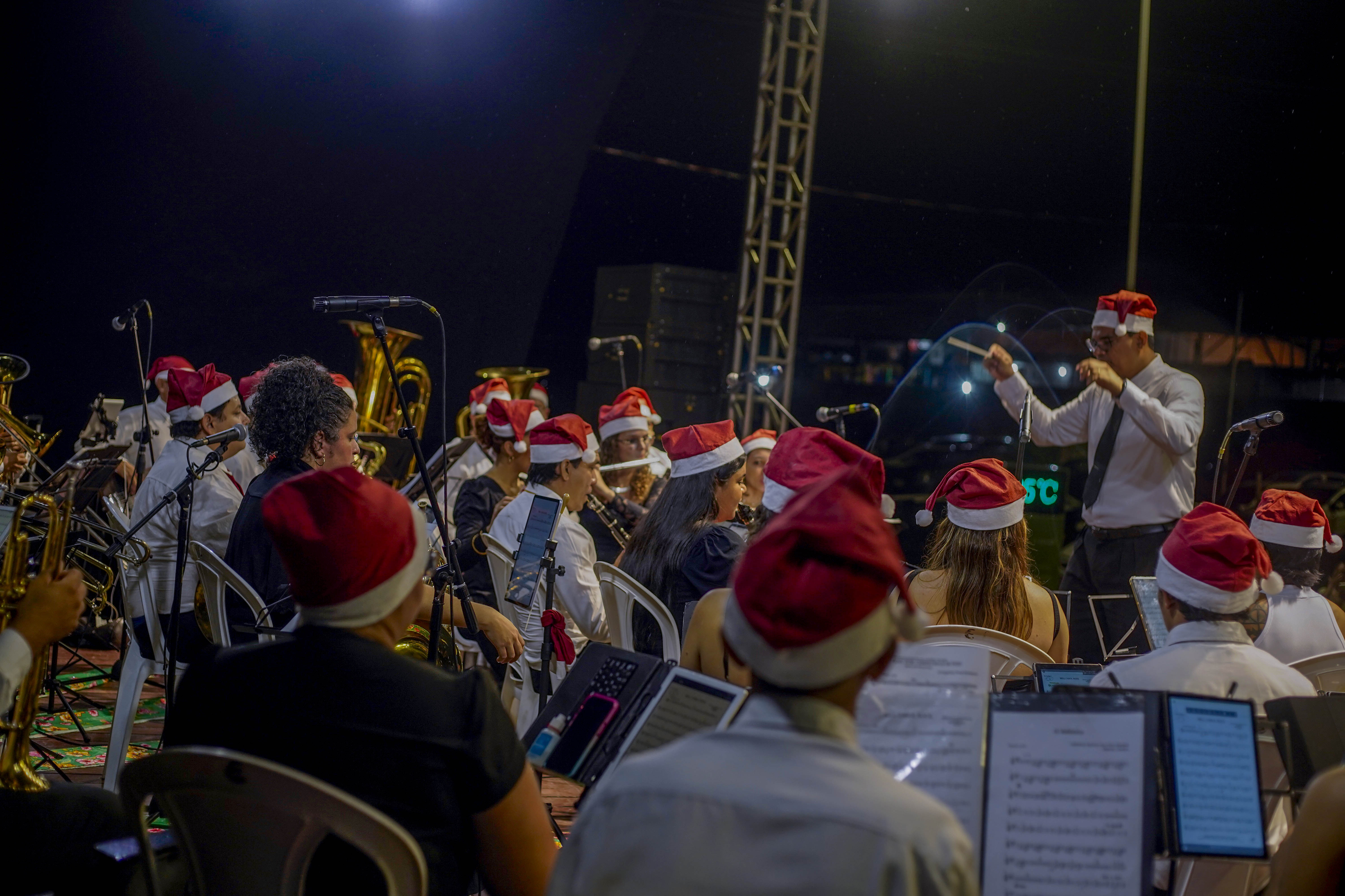 Arte, música e conscientização ambiental marcaram a noite deste sábado (20), na Praça de Eventos da Avenida Anysio Chaves. O público prestigiou a apresentação teatral do grupo Kauré, com a peça “A Cigarra e a Formiga na Flona”, seguida pelo espetáculo da Filarmônica Municipal Professor José Agostinho. A programação reuniu famílias e fortaleceu o clima de confraternização do período natalino. Promovidas pela Prefeitura de Santarém, por meio da Secretaria Municipal de Cultura (Semc), as atividades integram o Natal Iluminado, que segue até o dia 6 de janeiro.