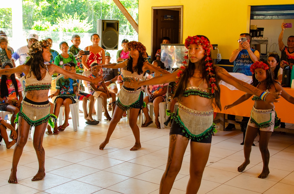 Um ritual indígena, realizado pelos moradores da aldeia, e a execução do Hino Nacional na língua Nheengatu marcaram a recepção à comitiva.