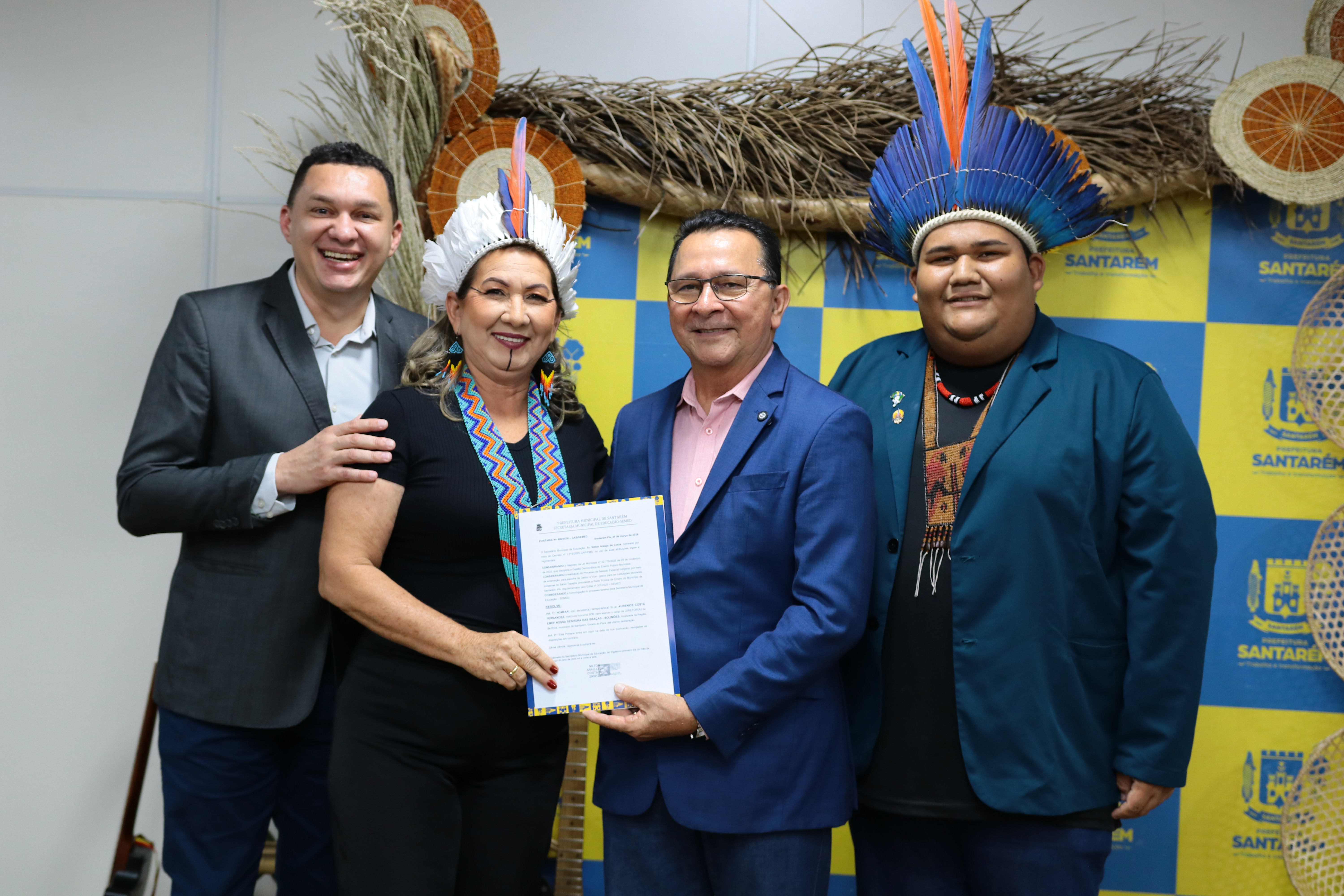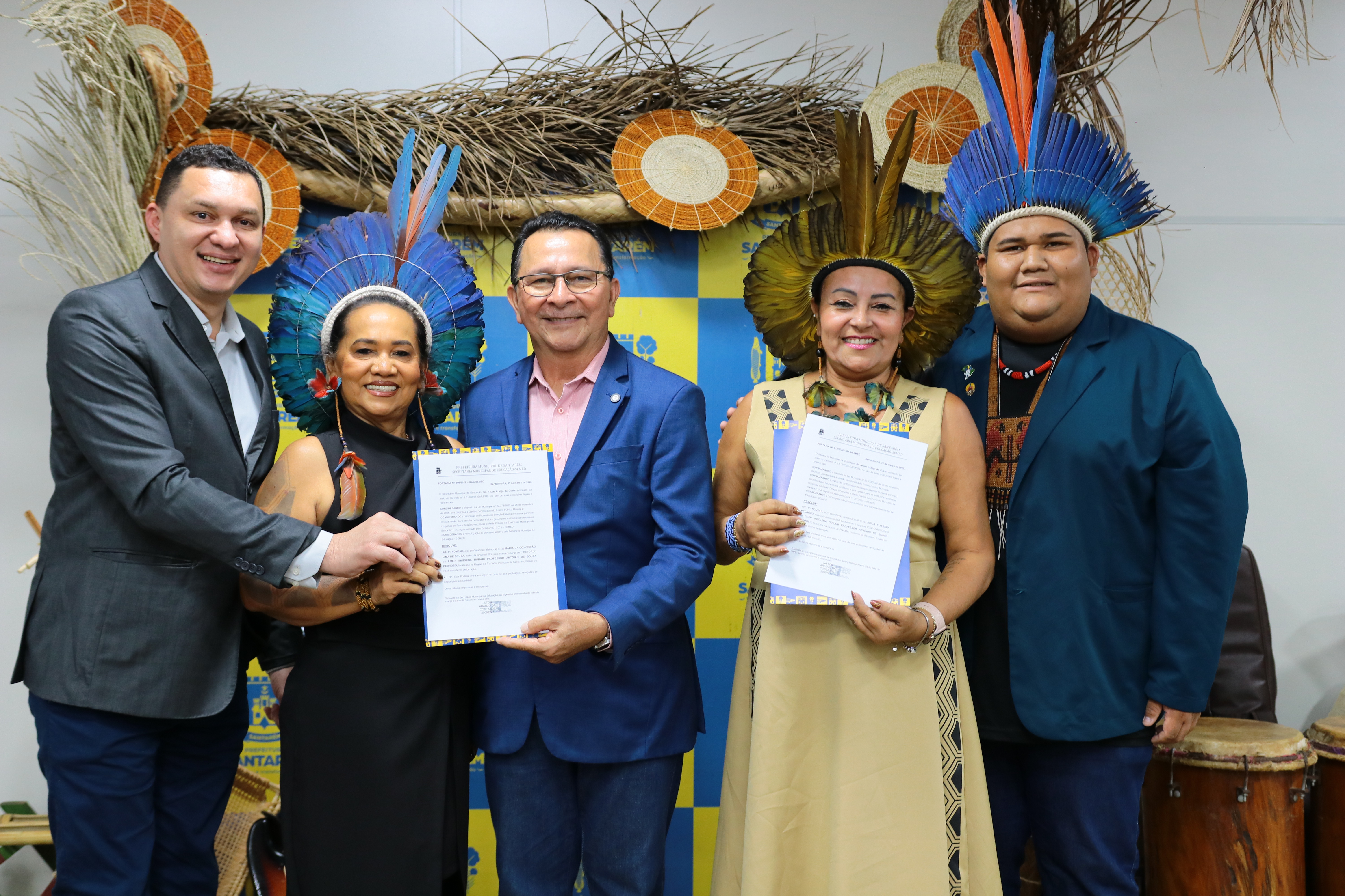 Foram empossados, na terça-feira (31), no auditório Manoel Cavalcante, da Secretaria Municipal de Educação (Semed), 23 gestores de escolas indígenas de Santarém. A cerimônia foi marcada pela valorização cultural, com início em um tradicional “banho de cheiro”, seguido de apresentação de música regional e da entrega dos documentos de posse aos novos gestores.