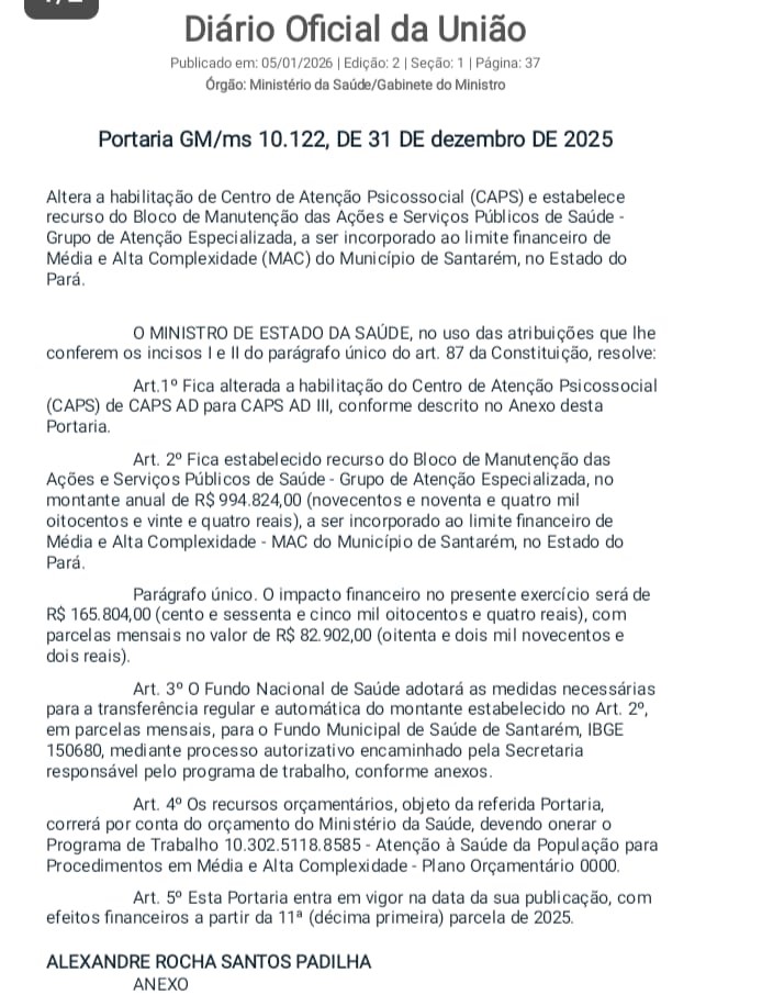 Os recursos serão transferidos de forma regular e automática pelo Fundo Nacional de Saúde ao Fundo Municipal de Saúde de Santarém, fortalecendo a rede de atenção psicossocial e ampliando a capacidade de atendimento do CAPS AD III.