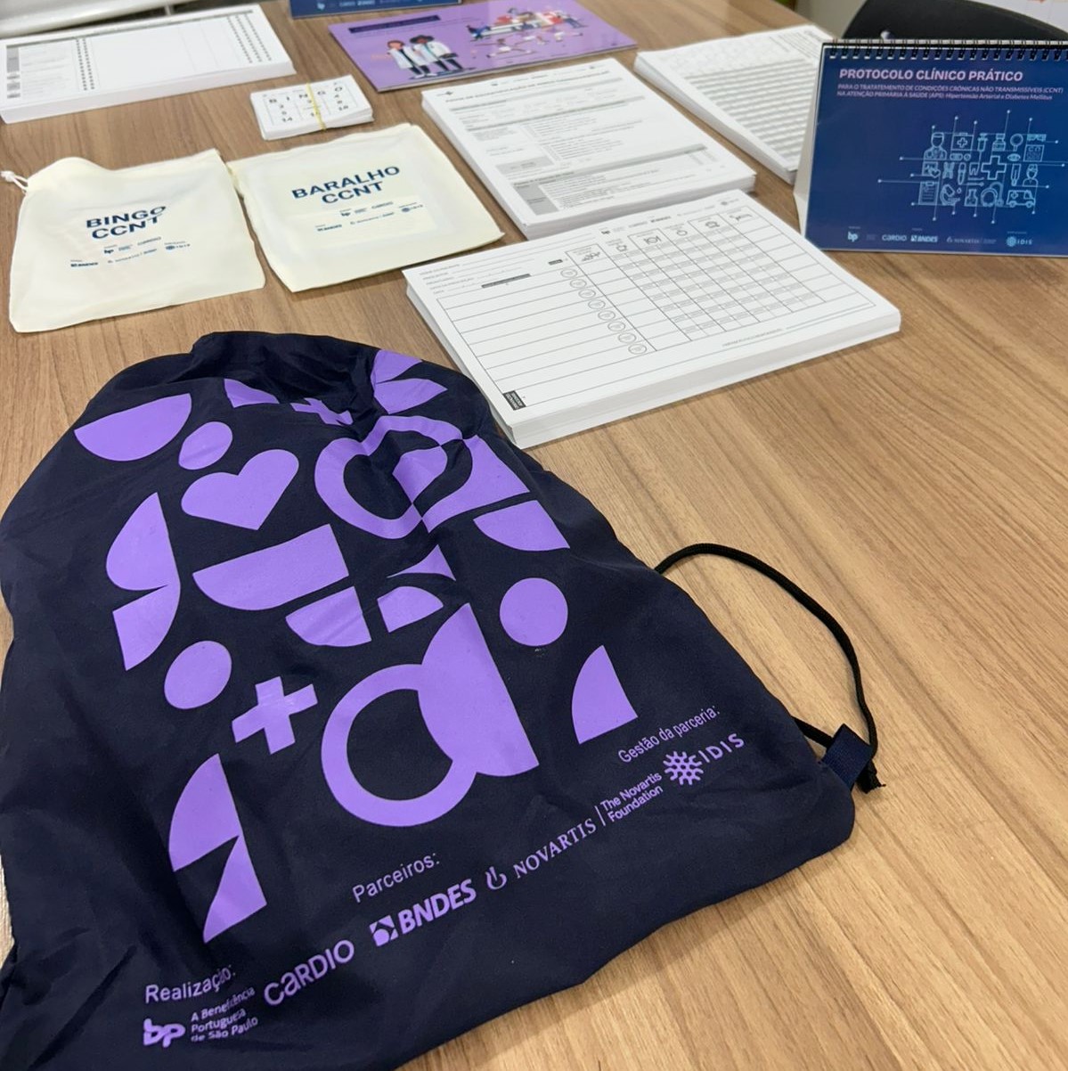 Cada unidade de saúde receberá um kit composto por diversos materiais pedagógicos e de apoio, entre eles: Combo Adesão (com álbum seriado e protocolo clínico prático), Cantinho CARDIO, Mural de Prevalência, Plano de Autocuidado, Modelo de Gestão e Governança e o Guia CARDIO na Escola.