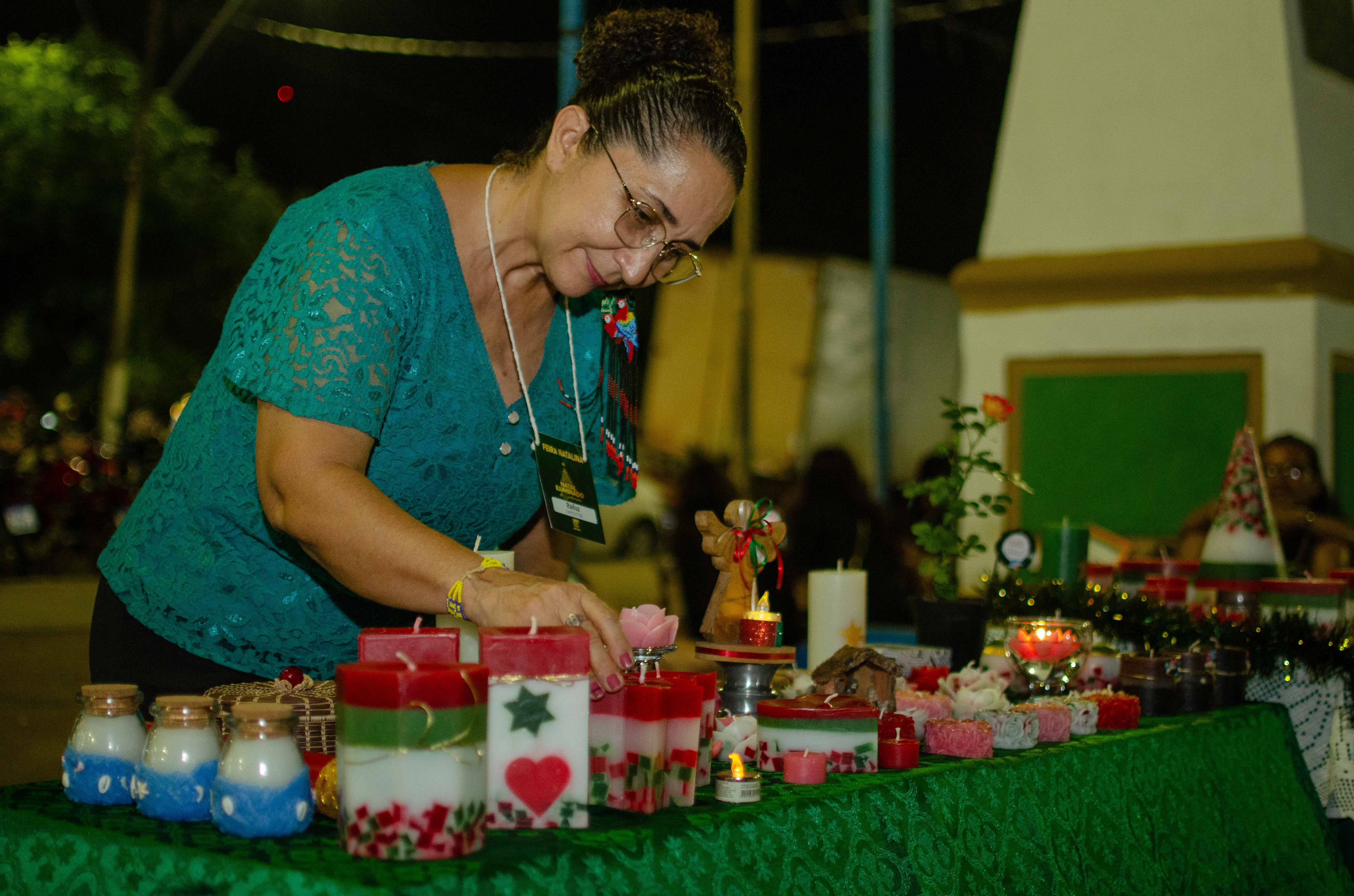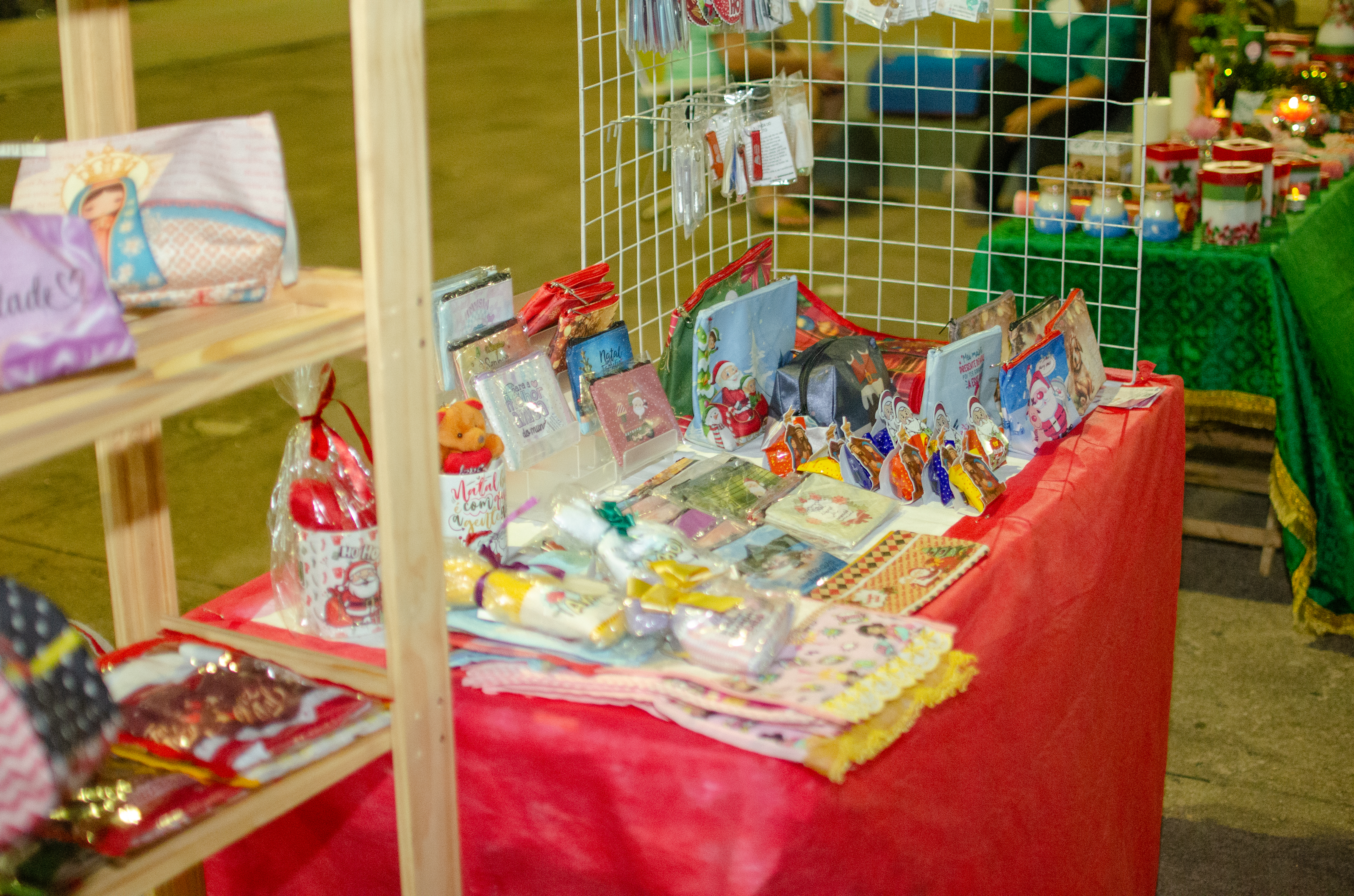 Nos estandes, o público encontra velas artesanais, sabonetes, perfumes, tapetes de crochê, doces, chocolates, bolos, bolsas, chaveiros, brincos, pulseiras, cordões, plantas e peças decorativas com temática natalina e regional, produtos que carregam história, tradição e identidade cultural.