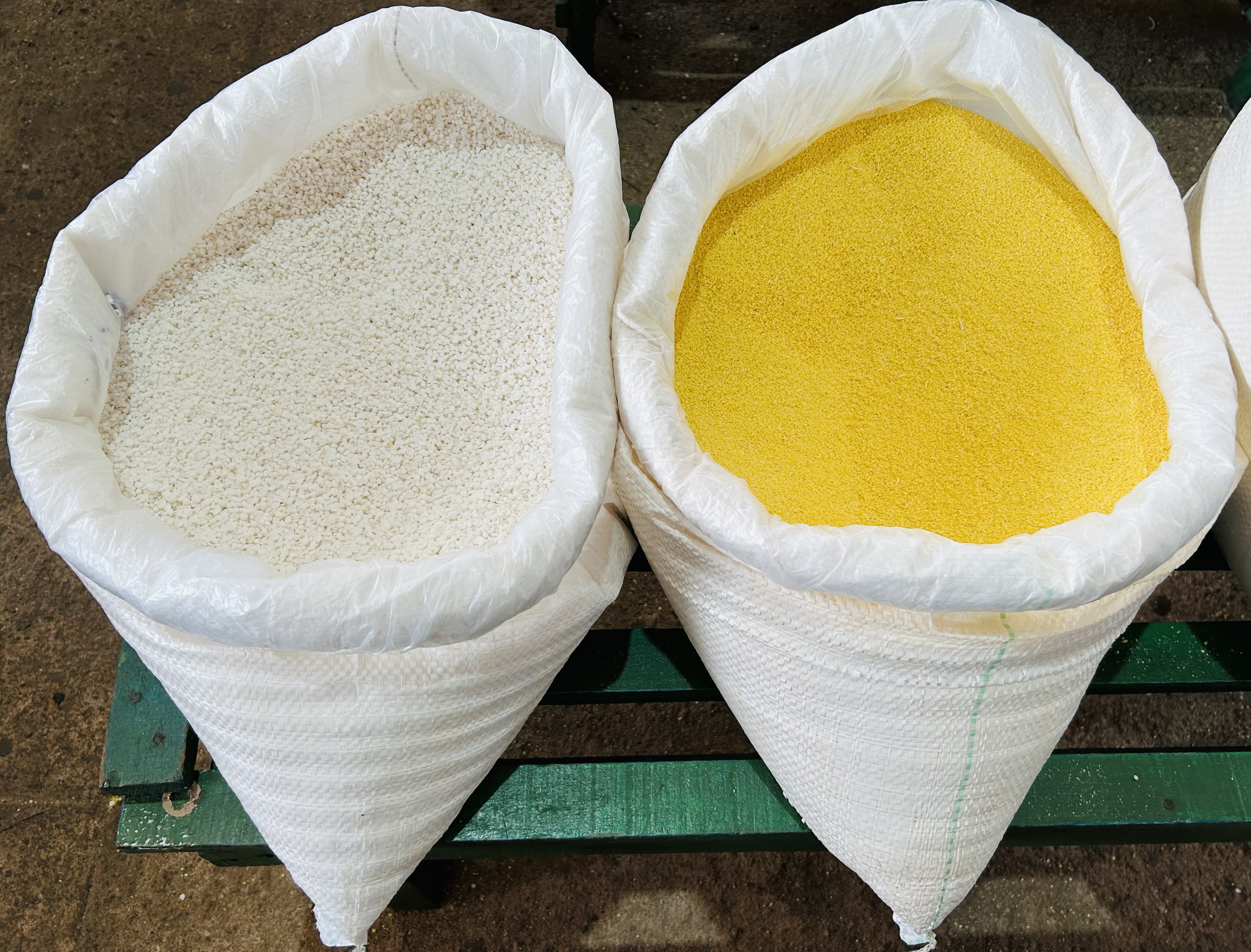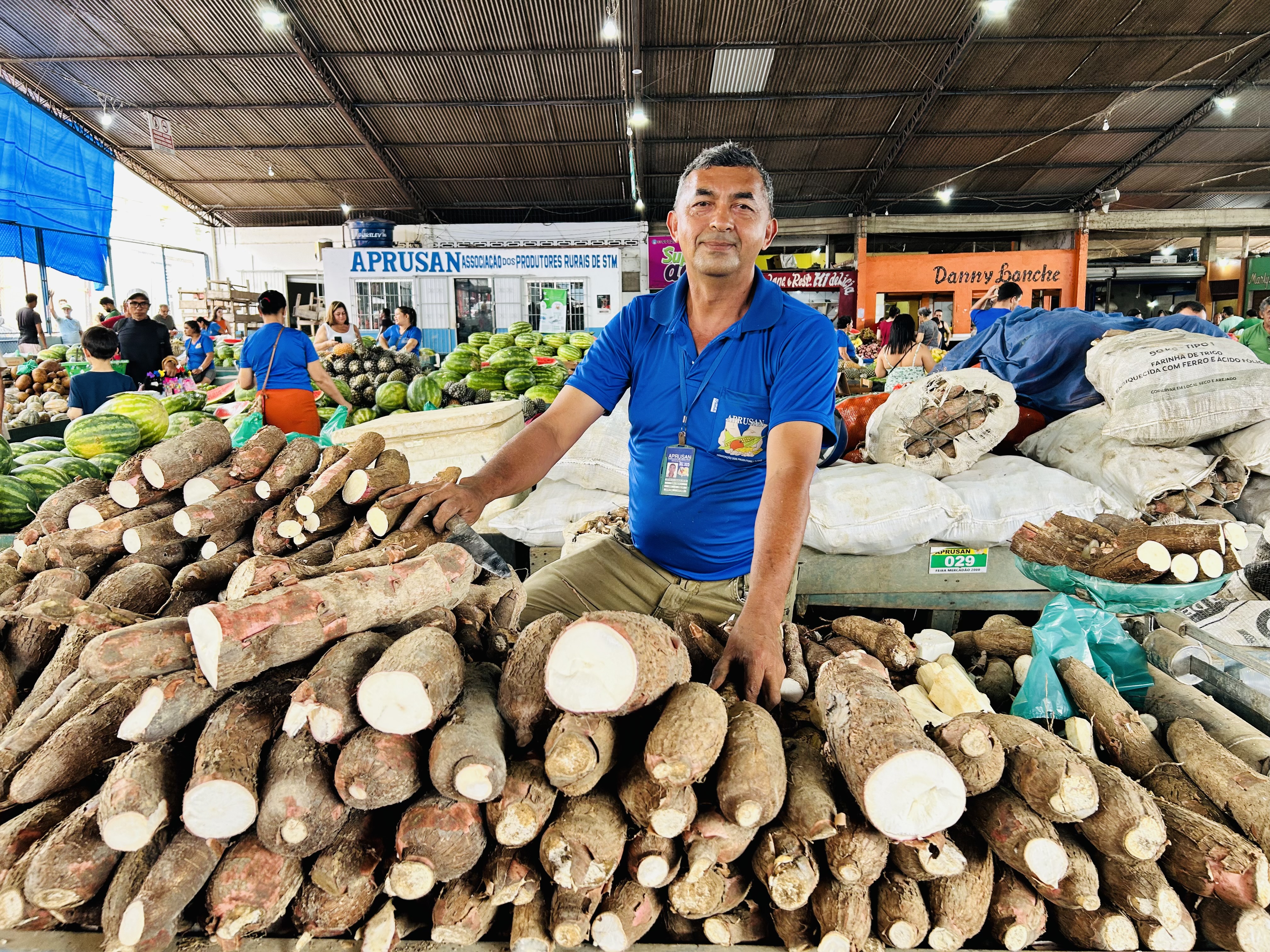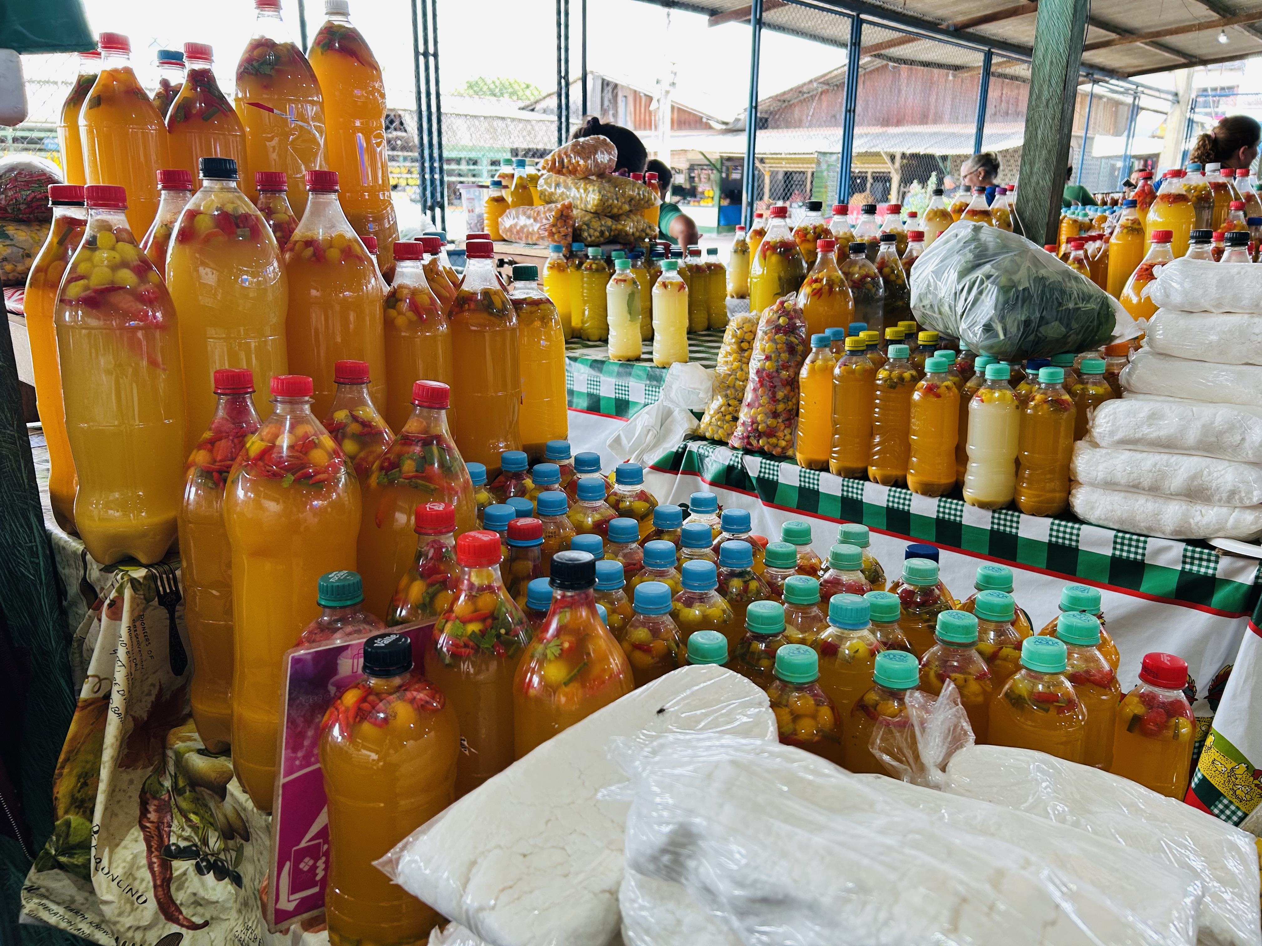 Logo à primeira vista, as cores chamam a atenção e evidenciam a presença marcante dos produtos derivados da mandioca, base da alimentação regional. O amarelo intenso do tucupi engarrafado se destaca entre as bancas e, ao lado, surgem as farinhas mais finas, utilizadas na produção do beiju e da tapioca, ampliando a experiência sensorial do visitante. As sacas de farinha, em diferentes tipos e granulações, convidam o público a conhecer sabores, texturas e modos de preparo que atravessam gerações.