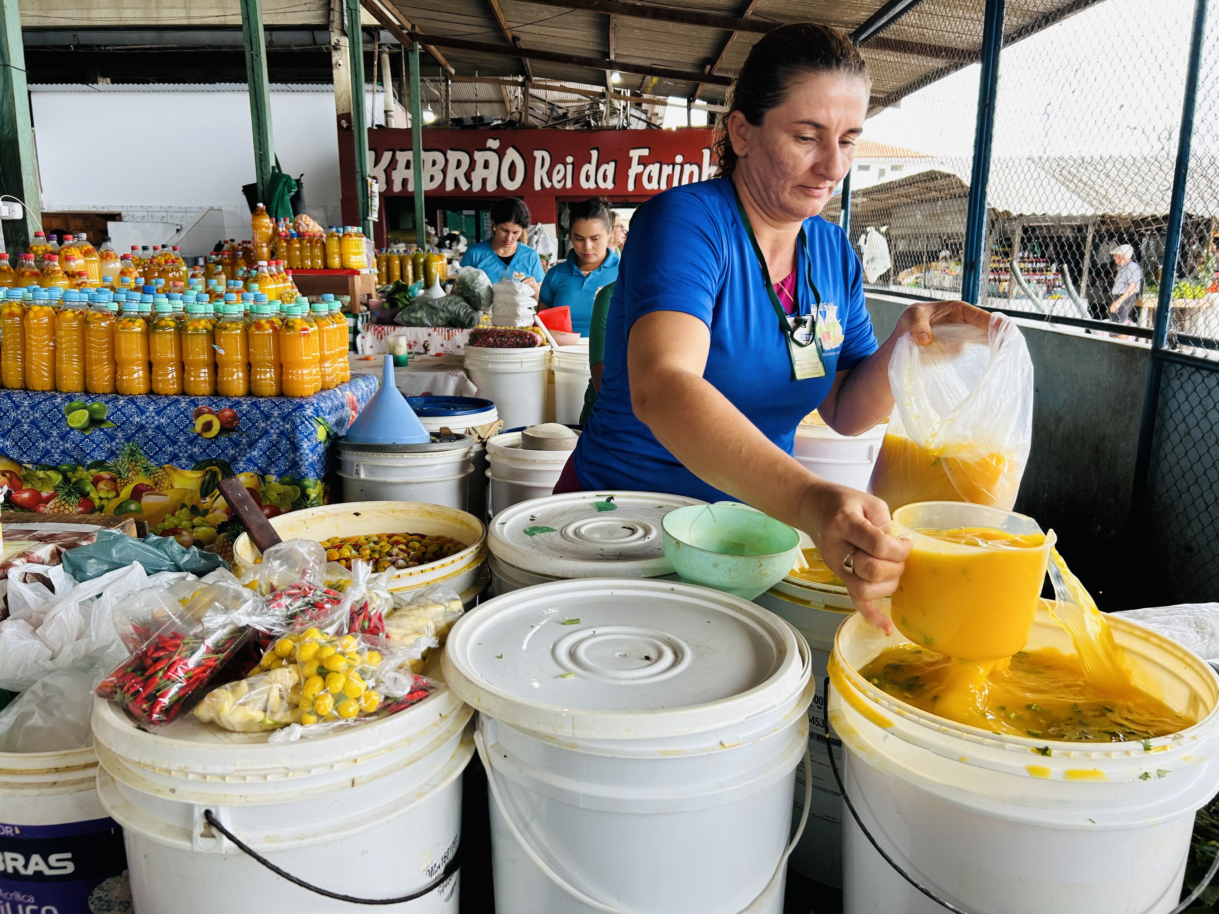 Na barraca de Nilta Frota, que atua há 17 anos na feira, a venda de tucupi é constante. “Aqui vendemos tucupi todos os dias. É com essa renda que consigo sustentar minha família”, relata.
