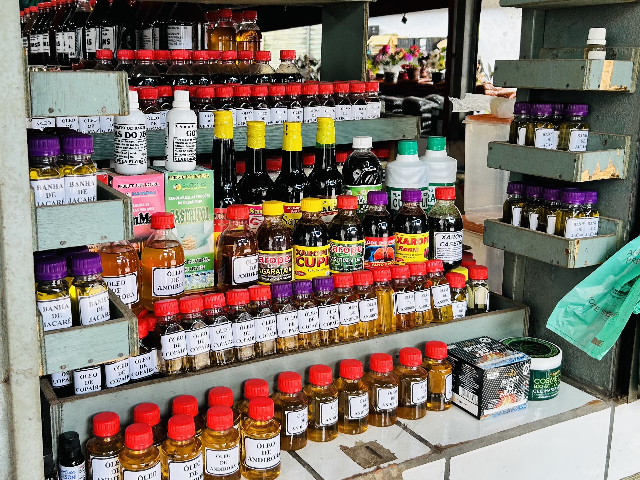 Outro destaque são as barracas de medicina tradicional, que oferecem paus medicinais como uxi-amarelo, aroeira, invirolata e verônica, além de xaropes caseiros à base de cumaru. De acordo com o feirante Gabriel Warley, as garrafadas voltadas para inflamação e diabetes estão entre as mais procuradas. “Cada uma custa R$ 20 e tem muita saída, tanto para moradores quanto para turistas”, afirma.